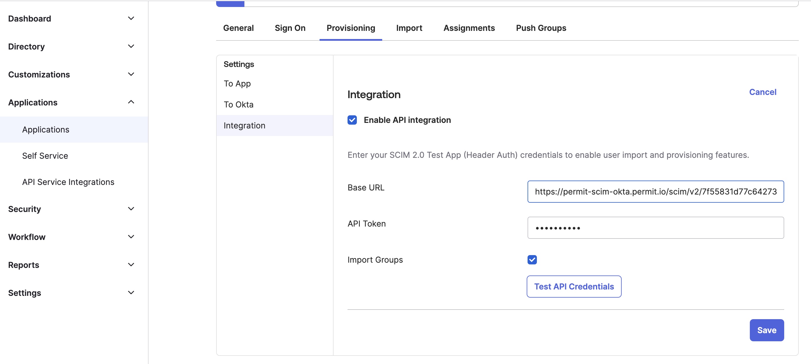 https://scim.eu-central-1.permit.io/scim/v2/{permit_project_id}/{permit_env_id}. - In the API Token field, enter your Permit API KEY.